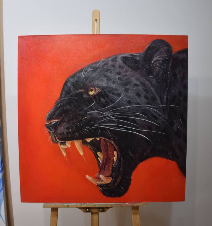 Эта работа — о внутренней силе, которая долго копится, а затем вырывается наружу. Черная пантера на алом фоне — символ грации, опасности и безмолвной ярости, которая пронзает всё вокруг.