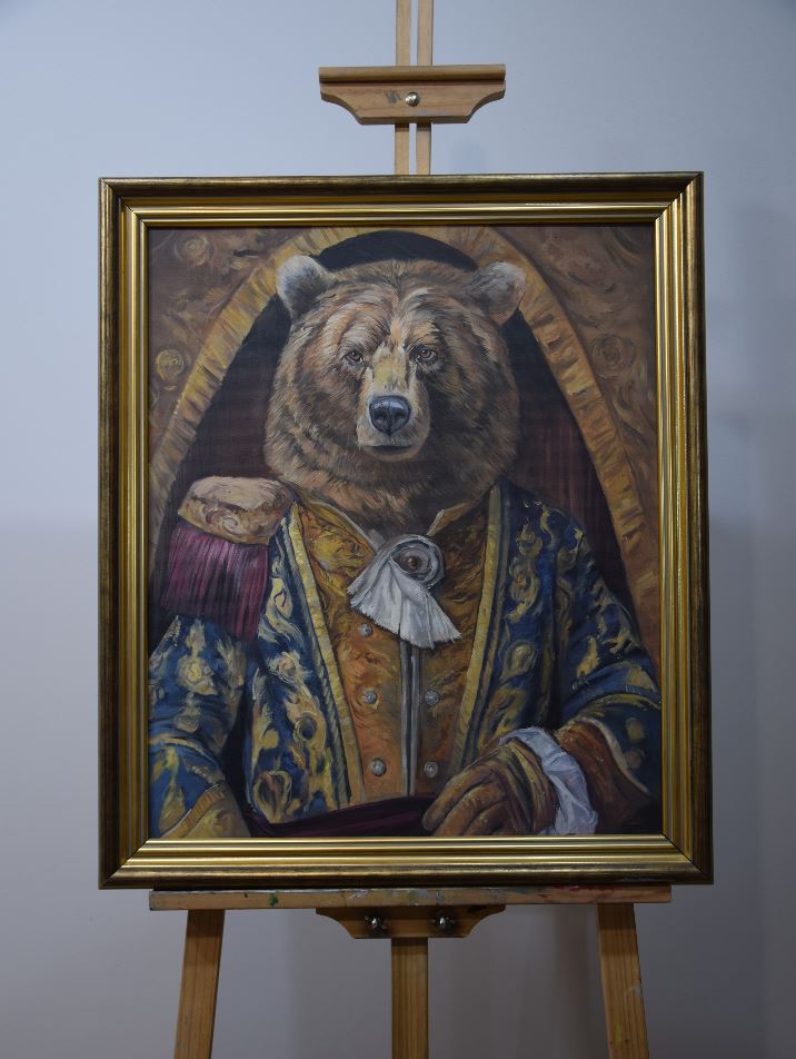 Образ бурого медведя представлен в аллегорической форме парадного портрета, отсылающего к традициям европейской живописи XVIII века. Монументальный и сдержанный, персонаж воплощает силу, достоинство и внутреннее спокойствие. Детально проработанный костюм и благородная цветовая палитра подчёркивают ироничное, но уважительное переосмысление классического жанра. Картина соединяет анималистику и портретную традицию, создавая выразительный арт-объект, способный стать акцентом в коллекционном или интерьерном пространстве.