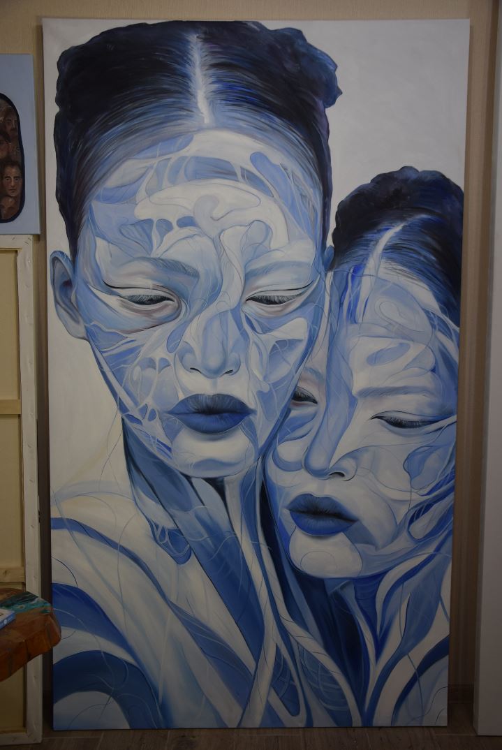 Картина раскрывает тему ментальной связи — невидимого, но ощутимого контакта между двумя состояниями сознания. Образы словно настроены на одну волну: их ритмы, дыхание и внутренние движения совпадают, формируя общее поле тишины и концентрации. Холодная сине-белая палитра и текучие линии подчёркивают нематериальную природу этой связи, похожей на поток мысли или энергии. Здесь синхронизация происходит не на физическом уровне, а в пространстве чувств, интуиции и общего внутреннего опыта, где расстояние и время теряют значение.