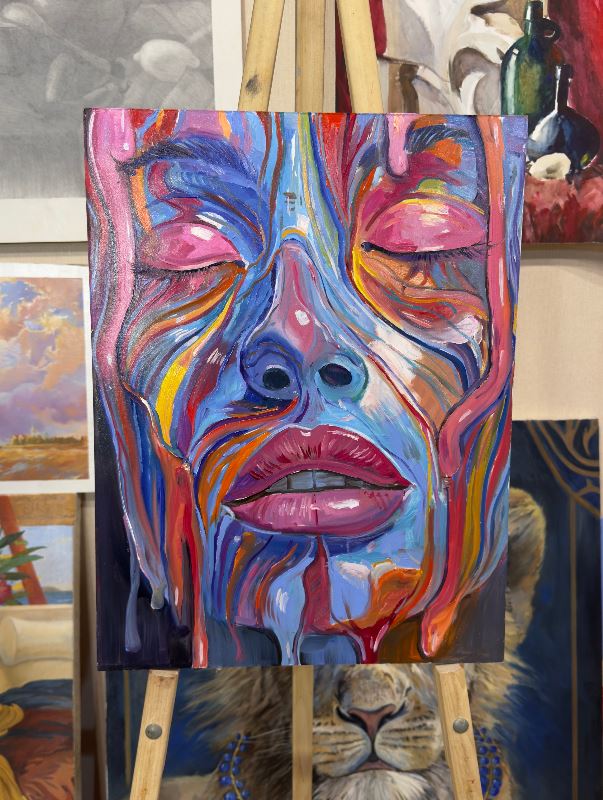 Картина передаёт состояние яркого внутреннего импульса, где эмоции выходят за пределы формы и превращаются в цвет. Лицо словно растворяется в потоке насыщенных оттенков — розовых, синих, оранжевых, — создавая ощущение липкой, тягучей энергии, похожей на момент перед тем, как лопается пузырь жвачки. Закрытые глаза усиливают эффект погружения внутрь себя, а глянцевая фактура мазков добавляет чувственности и дерзости образу. Работа говорит о хрупком балансе между удовольствием и перенасыщением, игрой и внутренним напряжением, превращая эмоцию в визуальный взрыв.
