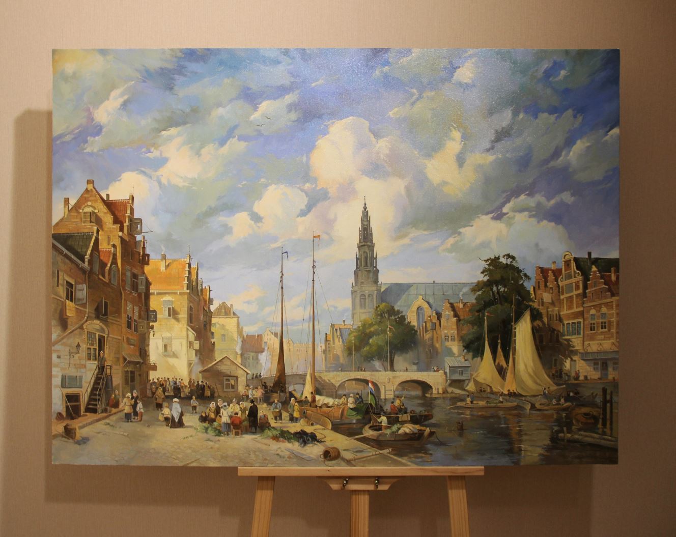 Картина раскрывает живую атмосферу голландского города, где торговля и повседневная жизнь переплетаются у воды. Каменные дома с характерными фасадами выстраиваются вдоль канала, отражаясь в спокойной глади, а лодки и парусники подчёркивают значение воды как главной артерии города. Фигуры людей, занятых делами и разговорами, наполняют сцену движением и человеческим теплом. Светлое небо и мягкая цветовая палитра создают ощущение открытости и благополучия, передавая дух Нидерландов — страны торговли, свободы и неспешного ритма жизни.
