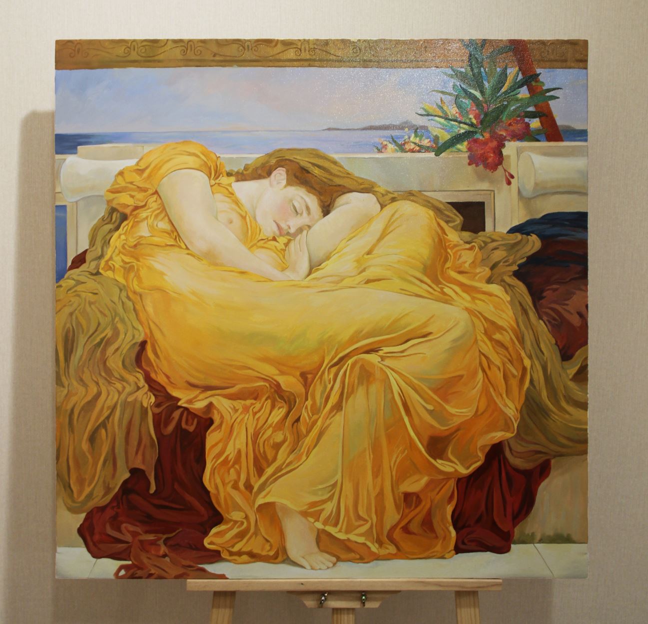 Картина погружает зрителя в состояние томного летнего покоя, где жар полудня словно растворяет время. Фигура спящей женщины утопает в волнах золотистых и янтарных драпировок, напоминающих разогретые солнцем поля и раскалённый воздух южного дня. Ткани текут, как медленный сон, обволакивая тело мягким, почти огненным светом.