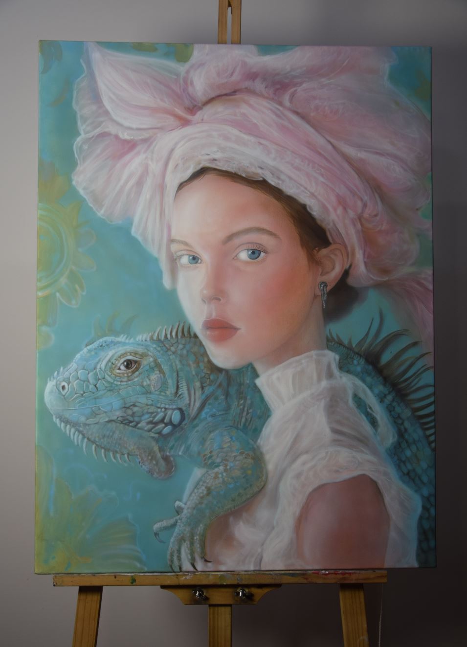 Игуана, расположившаяся рядом, выступает символом мудрости, выносливости и первозданной силы. Она подчёркивает внутреннюю власть героини — тихую, но несомненную. Мягкая живописная пластика и приглушённая палитра создают ощущение тропического сна, в котором роскошь проявляется не в демонстрации, а в естественной гармонии.
